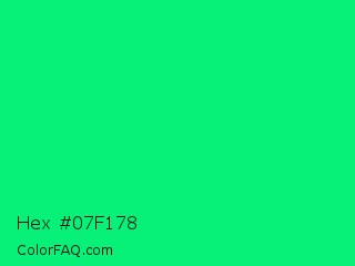 Hex #07f178 Color is a normal green color and the nearest color is Spring Green #00ff7f. Hex code #07f178 and RGB value is rgb(7,241,120). In RGB color space, this color is composed of 3% red, 95% green, 47% blue, In CMYK color space, this color is composed of 97% cyan, 0% magenta, 50% yellow , 5% black , In HSL color space, this color has a hue angle of 149° , 94% saturation and 49% lightness.