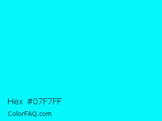 Hex #07f7ff Color is a normal cyan color and the nearest color is Cyan / Aqua #00ffff. Hex code #07f7ff and RGB value is rgb(7,247,255). In RGB color space, this color is composed of 3% red, 97% green, 100% blue, In CMYK color space, this color is composed of 97% cyan, 3% magenta, 0% yellow , 0% black , In HSL color space, this color has a hue angle of 182° , 100% saturation and 51% lightness.