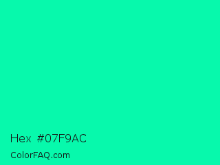 Hex #07f9ac Color is a normal green color and the nearest color is Medium Spring Green #00fa9a. Hex code #07f9ac and RGB value is rgb(7,249,172). In RGB color space, this color is composed of 3% red, 98% green, 67% blue, In CMYK color space, this color is composed of 97% cyan, 0% magenta, 31% yellow , 2% black , In HSL color space, this color has a hue angle of 161° , 95% saturation and 50% lightness.