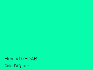 Hex #07fdab Color is a normal green color and the nearest color is Medium Spring Green #00fa9a. Hex code #07fdab and RGB value is rgb(7,253,171). In RGB color space, this color is composed of 3% red, 99% green, 67% blue, In CMYK color space, this color is composed of 97% cyan, 0% magenta, 32% yellow , 1% black , In HSL color space, this color has a hue angle of 160° , 98% saturation and 51% lightness.