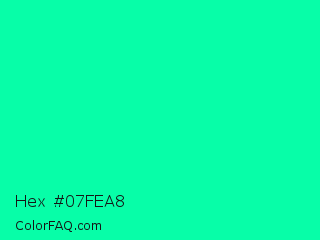 Hex #07fea8 Color is a normal green color and the nearest color is Medium Spring Green #00fa9a. Hex code #07fea8 and RGB value is rgb(7,254,168). In RGB color space, this color is composed of 3% red, 100% green, 66% blue, In CMYK color space, this color is composed of 97% cyan, 0% magenta, 34% yellow , 0% black , In HSL color space, this color has a hue angle of 159° , 99% saturation and 51% lightness.