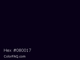 Hex #080017 Color is a almost black violet color and the nearest color is Black Russian #0a001c. Hex code #080017 and RGB value is rgb(8,0,23). In RGB color space, this color is composed of 3% red, 0% green, 9% blue, In CMYK color space, this color is composed of 65% cyan, 100% magenta, 0% yellow , 91% black , In HSL color space, this color has a hue angle of 261° , 100% saturation and 5% lightness.