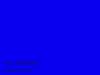 Hex #0800ef Color is a normal indigo color and the nearest color is Blue #0000ff. Hex code #0800ef and RGB value is rgb(8,0,239). In RGB color space, this color is composed of 3% red, 0% green, 94% blue, In CMYK color space, this color is composed of 97% cyan, 100% magenta, 0% yellow , 6% black , In HSL color space, this color has a hue angle of 242° , 100% saturation and 47% lightness.