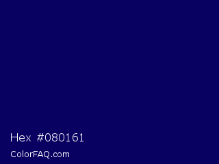 Hex #080161 Color is a very dark indigo color and the nearest color is Arapawa #110c6c. Hex code #080161 and RGB value is rgb(8,1,97). In RGB color space, this color is composed of 3% red, 0% green, 38% blue, In CMYK color space, this color is composed of 92% cyan, 99% magenta, 0% yellow , 62% black , In HSL color space, this color has a hue angle of 244° , 98% saturation and 19% lightness.