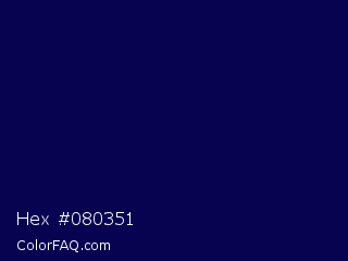 Hex #080351 Color is a very dark indigo color and the nearest color is Stratos #000741. Hex code #080351 and RGB value is rgb(8,3,81). In RGB color space, this color is composed of 3% red, 1% green, 32% blue, In CMYK color space, this color is composed of 90% cyan, 96% magenta, 0% yellow , 68% black , In HSL color space, this color has a hue angle of 244° , 93% saturation and 16% lightness.