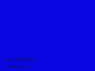 Hex #0805e1 Color is a normal indigo color and the nearest color is Medium Blue #0000cd. Hex code #0805e1 and RGB value is rgb(8,5,225). In RGB color space, this color is composed of 3% red, 2% green, 88% blue, In CMYK color space, this color is composed of 96% cyan, 98% magenta, 0% yellow , 12% black , In HSL color space, this color has a hue angle of 241° , 96% saturation and 45% lightness.