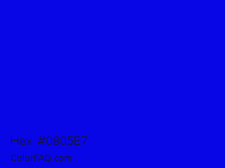 Hex #0805e7 Color is a normal indigo color and the nearest color is Blue #0000ff. Hex code #0805e7 and RGB value is rgb(8,5,231). In RGB color space, this color is composed of 3% red, 2% green, 91% blue, In CMYK color space, this color is composed of 97% cyan, 98% magenta, 0% yellow , 9% black , In HSL color space, this color has a hue angle of 241° , 96% saturation and 46% lightness.