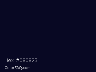 Hex #080823 Color is a almost black blue color and the nearest color is Deep Ebony #0c0b1d. Hex code #080823 and RGB value is rgb(8,8,35). In RGB color space, this color is composed of 3% red, 3% green, 14% blue, In CMYK color space, this color is composed of 77% cyan, 77% magenta, 0% yellow , 86% black , In HSL color space, this color has a hue angle of 240° , 63% saturation and 8% lightness.