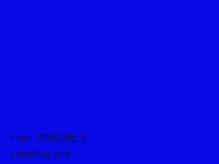 Hex #0808e4 Color is a normal blue color and the nearest color is Medium Blue #0000cd. Hex code #0808e4 and RGB value is rgb(8,8,228). In RGB color space, this color is composed of 3% red, 3% green, 89% blue, In CMYK color space, this color is composed of 96% cyan, 96% magenta, 0% yellow , 11% black , In HSL color space, this color has a hue angle of 240° , 93% saturation and 46% lightness.