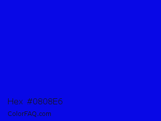 Hex #0808e6 Color is a normal blue color and the nearest color is Medium Blue #0000cd. Hex code #0808e6 and RGB value is rgb(8,8,230). In RGB color space, this color is composed of 3% red, 3% green, 90% blue, In CMYK color space, this color is composed of 97% cyan, 97% magenta, 0% yellow , 10% black , In HSL color space, this color has a hue angle of 240° , 93% saturation and 47% lightness.