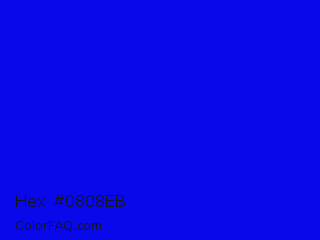 Hex #0808eb Color is a normal blue color and the nearest color is Blue #0000ff. Hex code #0808eb and RGB value is rgb(8,8,235). In RGB color space, this color is composed of 3% red, 3% green, 92% blue, In CMYK color space, this color is composed of 97% cyan, 97% magenta, 0% yellow , 8% black , In HSL color space, this color has a hue angle of 240° , 93% saturation and 48% lightness.