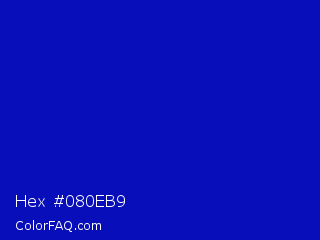 Hex #080eb9 Color is a normal blue color and the nearest color is Zaffre #0014a8. Hex code #080eb9 and RGB value is rgb(8,14,185). In RGB color space, this color is composed of 3% red, 5% green, 73% blue, In CMYK color space, this color is composed of 96% cyan, 92% magenta, 0% yellow , 27% black , In HSL color space, this color has a hue angle of 238° , 92% saturation and 38% lightness.