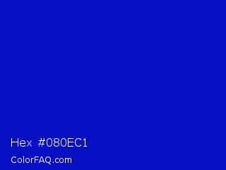 Hex #080ec1 Color is a normal blue color and the nearest color is Dark Blue #0000c8. Hex code #080ec1 and RGB value is rgb(8,14,193). In RGB color space, this color is composed of 3% red, 5% green, 76% blue, In CMYK color space, this color is composed of 96% cyan, 93% magenta, 0% yellow , 24% black , In HSL color space, this color has a hue angle of 238° , 92% saturation and 39% lightness.