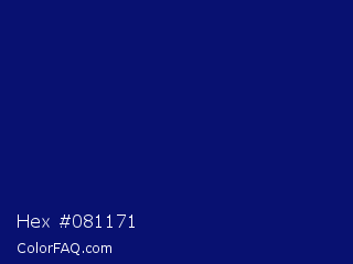 Hex #081171 Color is a dark blue color and the nearest color is Arapawa #110c6c. Hex code #081171 and RGB value is rgb(8,17,113). In RGB color space, this color is composed of 3% red, 7% green, 44% blue, In CMYK color space, this color is composed of 93% cyan, 85% magenta, 0% yellow , 56% black , In HSL color space, this color has a hue angle of 235° , 87% saturation and 24% lightness.