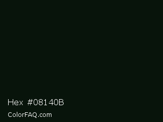 Hex #08140b Color is a almost black green color and the nearest color is Gordons Green #0b1107. Hex code #08140b and RGB value is rgb(8,20,11). In RGB color space, this color is composed of 3% red, 8% green, 4% blue, In CMYK color space, this color is composed of 60% cyan, 0% magenta, 45% yellow , 92% black , In HSL color space, this color has a hue angle of 135° , 43% saturation and 5% lightness.