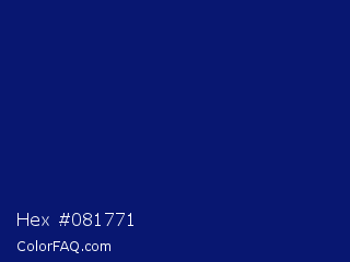 Hex #081771 Color is a dark blue color and the nearest color is Arapawa #110c6c. Hex code #081771 and RGB value is rgb(8,23,113). In RGB color space, this color is composed of 3% red, 9% green, 44% blue, In CMYK color space, this color is composed of 93% cyan, 80% magenta, 0% yellow , 56% black , In HSL color space, this color has a hue angle of 231° , 87% saturation and 24% lightness.