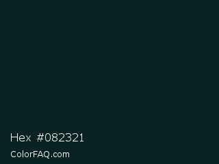 Hex #082321 Color is a almost black cyan color and the nearest color is Aztec #0d1c19. Hex code #082321 and RGB value is rgb(8,35,33). In RGB color space, this color is composed of 3% red, 14% green, 13% blue, In CMYK color space, this color is composed of 77% cyan, 0% magenta, 6% yellow , 86% black , In HSL color space, this color has a hue angle of 176° , 63% saturation and 8% lightness.
