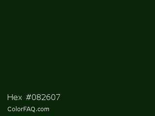 Hex #082607 Color is a almost black green color and the nearest color is Palm Green #09230f. Hex code #082607 and RGB value is rgb(8,38,7). In RGB color space, this color is composed of 3% red, 15% green, 3% blue, In CMYK color space, this color is composed of 79% cyan, 0% magenta, 82% yellow , 85% black , In HSL color space, this color has a hue angle of 118° , 69% saturation and 9% lightness.