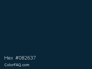 Hex #082637 Color is a very dark blue color and the nearest color is Daintree #012731. Hex code #082637 and RGB value is rgb(8,38,55). In RGB color space, this color is composed of 3% red, 15% green, 22% blue, In CMYK color space, this color is composed of 85% cyan, 31% magenta, 0% yellow , 78% black , In HSL color space, this color has a hue angle of 202° , 75% saturation and 12% lightness.