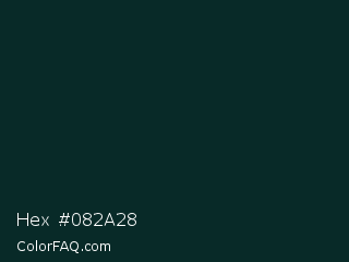 Hex #082a28 Color is a very dark cyan color and the nearest color is Firefly #0e2a30. Hex code #082a28 and RGB value is rgb(8,42,40). In RGB color space, this color is composed of 3% red, 16% green, 16% blue, In CMYK color space, this color is composed of 81% cyan, 0% magenta, 5% yellow , 84% black , In HSL color space, this color has a hue angle of 176° , 68% saturation and 10% lightness.