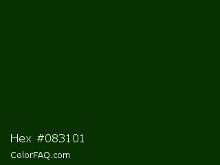 Hex #083101 Color is a very dark green color and the nearest color is Deep Fir #002900. Hex code #083101 and RGB value is rgb(8,49,1). In RGB color space, this color is composed of 3% red, 19% green, 0% blue, In CMYK color space, this color is composed of 84% cyan, 0% magenta, 98% yellow , 81% black , In HSL color space, this color has a hue angle of 111° , 96% saturation and 10% lightness.