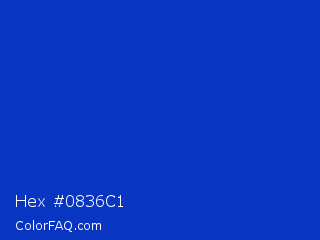 Hex #0836c1 Color is a normal blue color and the nearest color is Absolute Zero #0048ba. Hex code #0836c1 and RGB value is rgb(8,54,193). In RGB color space, this color is composed of 3% red, 21% green, 76% blue, In CMYK color space, this color is composed of 96% cyan, 72% magenta, 0% yellow , 24% black , In HSL color space, this color has a hue angle of 225° , 92% saturation and 39% lightness.