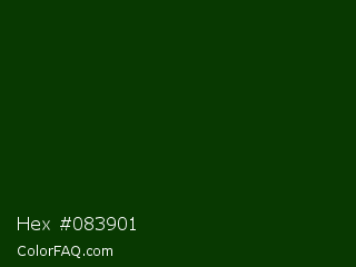 Hex #083901 Color is a very dark green color and the nearest color is Deep Fir #002900. Hex code #083901 and RGB value is rgb(8,57,1). In RGB color space, this color is composed of 3% red, 22% green, 0% blue, In CMYK color space, this color is composed of 86% cyan, 0% magenta, 98% yellow , 78% black , In HSL color space, this color has a hue angle of 113° , 97% saturation and 11% lightness.