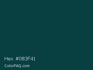 Hex #083f41 Color is a very dark cyan color and the nearest color is Cyprus #003e40. Hex code #083f41 and RGB value is rgb(8,63,65). In RGB color space, this color is composed of 3% red, 25% green, 25% blue, In CMYK color space, this color is composed of 88% cyan, 3% magenta, 0% yellow , 75% black , In HSL color space, this color has a hue angle of 182° , 78% saturation and 14% lightness.