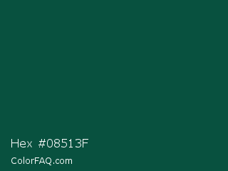 Hex #08513f Color is a very dark cyan color and the nearest color is Sacramento State Green #00563f. Hex code #08513f and RGB value is rgb(8,81,63). In RGB color space, this color is composed of 3% red, 32% green, 25% blue, In CMYK color space, this color is composed of 90% cyan, 0% magenta, 22% yellow , 68% black , In HSL color space, this color has a hue angle of 165° , 82% saturation and 17% lightness.