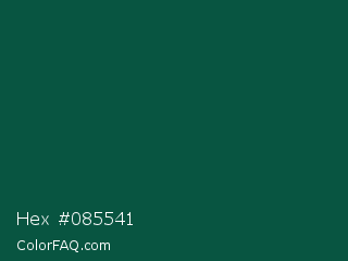 Hex #085541 Color is a very dark cyan color and the nearest color is Sacramento State Green #00563f. Hex code #085541 and RGB value is rgb(8,85,65). In RGB color space, this color is composed of 3% red, 33% green, 25% blue, In CMYK color space, this color is composed of 91% cyan, 0% magenta, 24% yellow , 67% black , In HSL color space, this color has a hue angle of 164° , 83% saturation and 18% lightness.