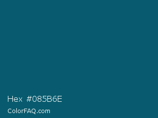 Hex #085b6e Color is a dark cyan color and the nearest color is Blue Stone #016162. Hex code #085b6e and RGB value is rgb(8,91,110). In RGB color space, this color is composed of 3% red, 36% green, 43% blue, In CMYK color space, this color is composed of 93% cyan, 17% magenta, 0% yellow , 57% black , In HSL color space, this color has a hue angle of 191° , 86% saturation and 23% lightness.