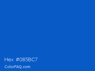 Hex #085bc7 Color is a normal blue color and the nearest color is Science Blue #0066cc. Hex code #085bc7 and RGB value is rgb(8,91,199). In RGB color space, this color is composed of 3% red, 36% green, 78% blue, In CMYK color space, this color is composed of 96% cyan, 54% magenta, 0% yellow , 22% black , In HSL color space, this color has a hue angle of 214° , 92% saturation and 41% lightness.