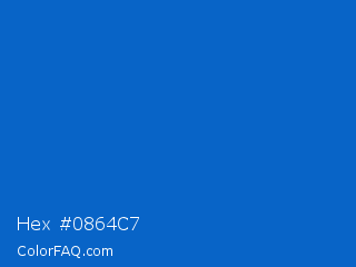 Hex #0864c7 Color is a normal blue color and the nearest color is Science Blue #0066cc. Hex code #0864c7 and RGB value is rgb(8,100,199). In RGB color space, this color is composed of 3% red, 39% green, 78% blue, In CMYK color space, this color is composed of 96% cyan, 50% magenta, 0% yellow , 22% black , In HSL color space, this color has a hue angle of 211° , 92% saturation and 41% lightness.