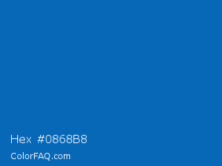 Hex #0868b8 Color is a normal blue color and the nearest color is Green Blue #1164b4. Hex code #0868b8 and RGB value is rgb(8,104,184). In RGB color space, this color is composed of 3% red, 41% green, 72% blue, In CMYK color space, this color is composed of 96% cyan, 43% magenta, 0% yellow , 28% black , In HSL color space, this color has a hue angle of 207° , 92% saturation and 38% lightness.