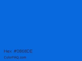Hex #0868de Color is a normal blue color and the nearest color is Science Blue #0066cc. Hex code #0868de and RGB value is rgb(8,104,222). In RGB color space, this color is composed of 3% red, 41% green, 87% blue, In CMYK color space, this color is composed of 96% cyan, 53% magenta, 0% yellow , 13% black , In HSL color space, this color has a hue angle of 213° , 93% saturation and 45% lightness.