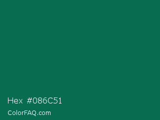 Hex #086c51 Color is a dark cyan color and the nearest color is Watercourse #056f57. Hex code #086c51 and RGB value is rgb(8,108,81). In RGB color space, this color is composed of 3% red, 42% green, 32% blue, In CMYK color space, this color is composed of 93% cyan, 0% magenta, 25% yellow , 58% black , In HSL color space, this color has a hue angle of 164° , 86% saturation and 23% lightness.