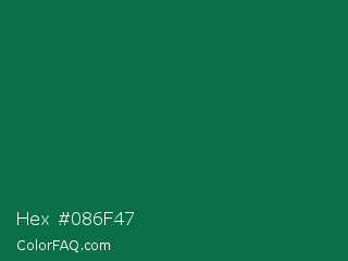 Hex #086f47 Color is a dark green color and the nearest color is Bottle Green #006a4e. Hex code #086f47 and RGB value is rgb(8,111,71). In RGB color space, this color is composed of 3% red, 44% green, 28% blue, In CMYK color space, this color is composed of 93% cyan, 0% magenta, 36% yellow , 56% black , In HSL color space, this color has a hue angle of 157° , 87% saturation and 23% lightness.