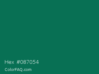 Hex #087054 Color is a dark cyan color and the nearest color is Watercourse #056f57. Hex code #087054 and RGB value is rgb(8,112,84). In RGB color space, this color is composed of 3% red, 44% green, 33% blue, In CMYK color space, this color is composed of 93% cyan, 0% magenta, 25% yellow , 56% black , In HSL color space, this color has a hue angle of 164° , 87% saturation and 24% lightness.