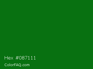 Hex #087111 Color is a dark green color and the nearest color is Japanese Laurel #0a6906. Hex code #087111 and RGB value is rgb(8,113,17). In RGB color space, this color is composed of 3% red, 44% green, 7% blue, In CMYK color space, this color is composed of 93% cyan, 0% magenta, 85% yellow , 56% black , In HSL color space, this color has a hue angle of 125° , 87% saturation and 24% lightness.