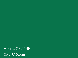 Hex #08744b Color is a dark green color and the nearest color is Salem #097f4b. Hex code #08744b and RGB value is rgb(8,116,75). In RGB color space, this color is composed of 3% red, 45% green, 29% blue, In CMYK color space, this color is composed of 93% cyan, 0% magenta, 35% yellow , 55% black , In HSL color space, this color has a hue angle of 157° , 87% saturation and 24% lightness.