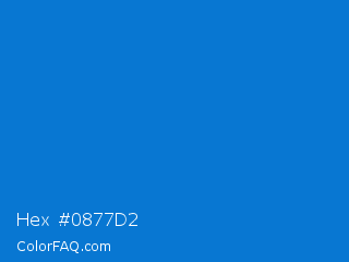 Hex #0877d2 Color is a normal blue color and the nearest color is True Blue #0073cf. Hex code #0877d2 and RGB value is rgb(8,119,210). In RGB color space, this color is composed of 3% red, 47% green, 82% blue, In CMYK color space, this color is composed of 96% cyan, 43% magenta, 0% yellow , 18% black , In HSL color space, this color has a hue angle of 207° , 93% saturation and 43% lightness.