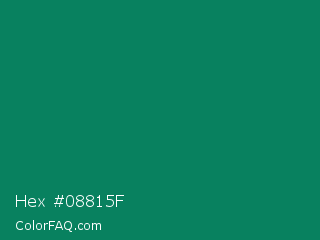 Hex #08815f Color is a dark green color and the nearest color is Deep Green Cyan Turquoise #0e7c61. Hex code #08815f and RGB value is rgb(8,129,95). In RGB color space, this color is composed of 3% red, 51% green, 37% blue, In CMYK color space, this color is composed of 94% cyan, 0% magenta, 26% yellow , 49% black , In HSL color space, this color has a hue angle of 163° , 88% saturation and 27% lightness.