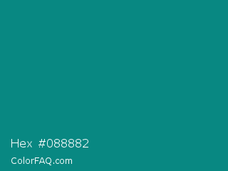Hex #088882 Color is a dark cyan color and the nearest color is Teal Green #00827f. Hex code #088882 and RGB value is rgb(8,136,130). In RGB color space, this color is composed of 3% red, 53% green, 51% blue, In CMYK color space, this color is composed of 94% cyan, 0% magenta, 4% yellow , 47% black , In HSL color space, this color has a hue angle of 177° , 89% saturation and 28% lightness.