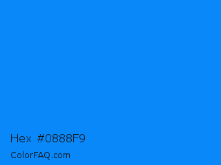 Hex #0888f9 Color is a normal blue color and the nearest color is Azure Radiance #007fff. Hex code #0888f9 and RGB value is rgb(8,136,249). In RGB color space, this color is composed of 3% red, 53% green, 98% blue, In CMYK color space, this color is composed of 97% cyan, 45% magenta, 0% yellow , 2% black , In HSL color space, this color has a hue angle of 208° , 95% saturation and 50% lightness.