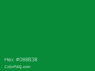 Hex #088b38 Color is a dark green color and the nearest color is North Texas Green #059033. Hex code #088b38 and RGB value is rgb(8,139,56). In RGB color space, this color is composed of 3% red, 55% green, 22% blue, In CMYK color space, this color is composed of 94% cyan, 0% magenta, 60% yellow , 45% black , In HSL color space, this color has a hue angle of 142° , 89% saturation and 29% lightness.