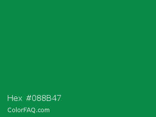 Hex #088b47 Color is a dark green color and the nearest color is Salem #097f4b. Hex code #088b47 and RGB value is rgb(8,139,71). In RGB color space, this color is composed of 3% red, 55% green, 28% blue, In CMYK color space, this color is composed of 94% cyan, 0% magenta, 49% yellow , 45% black , In HSL color space, this color has a hue angle of 149° , 89% saturation and 29% lightness.