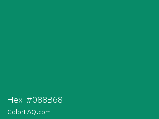 Hex #088b68 Color is a dark cyan color and the nearest color is Observatory #02866f. Hex code #088b68 and RGB value is rgb(8,139,104). In RGB color space, this color is composed of 3% red, 55% green, 41% blue, In CMYK color space, this color is composed of 94% cyan, 0% magenta, 25% yellow , 45% black , In HSL color space, this color has a hue angle of 164° , 89% saturation and 29% lightness.