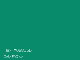 Hex #088b6b Color is a dark cyan color and the nearest color is Observatory #02866f. Hex code #088b6b and RGB value is rgb(8,139,107). In RGB color space, this color is composed of 3% red, 55% green, 42% blue, In CMYK color space, this color is composed of 94% cyan, 0% magenta, 23% yellow , 45% black , In HSL color space, this color has a hue angle of 165° , 89% saturation and 29% lightness.