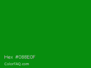 Hex #088e0f Color is a dark green color and the nearest color is India Green #138808. Hex code #088e0f and RGB value is rgb(8,142,15). In RGB color space, this color is composed of 3% red, 56% green, 6% blue, In CMYK color space, this color is composed of 94% cyan, 0% magenta, 89% yellow , 44% black , In HSL color space, this color has a hue angle of 123° , 89% saturation and 29% lightness.