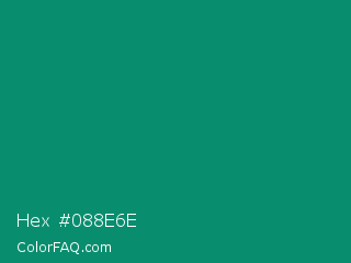 Hex #088e6e Color is a dark cyan color and the nearest color is Observatory #02866f. Hex code #088e6e and RGB value is rgb(8,142,110). In RGB color space, this color is composed of 3% red, 56% green, 43% blue, In CMYK color space, this color is composed of 94% cyan, 0% magenta, 23% yellow , 44% black , In HSL color space, this color has a hue angle of 166° , 89% saturation and 29% lightness.